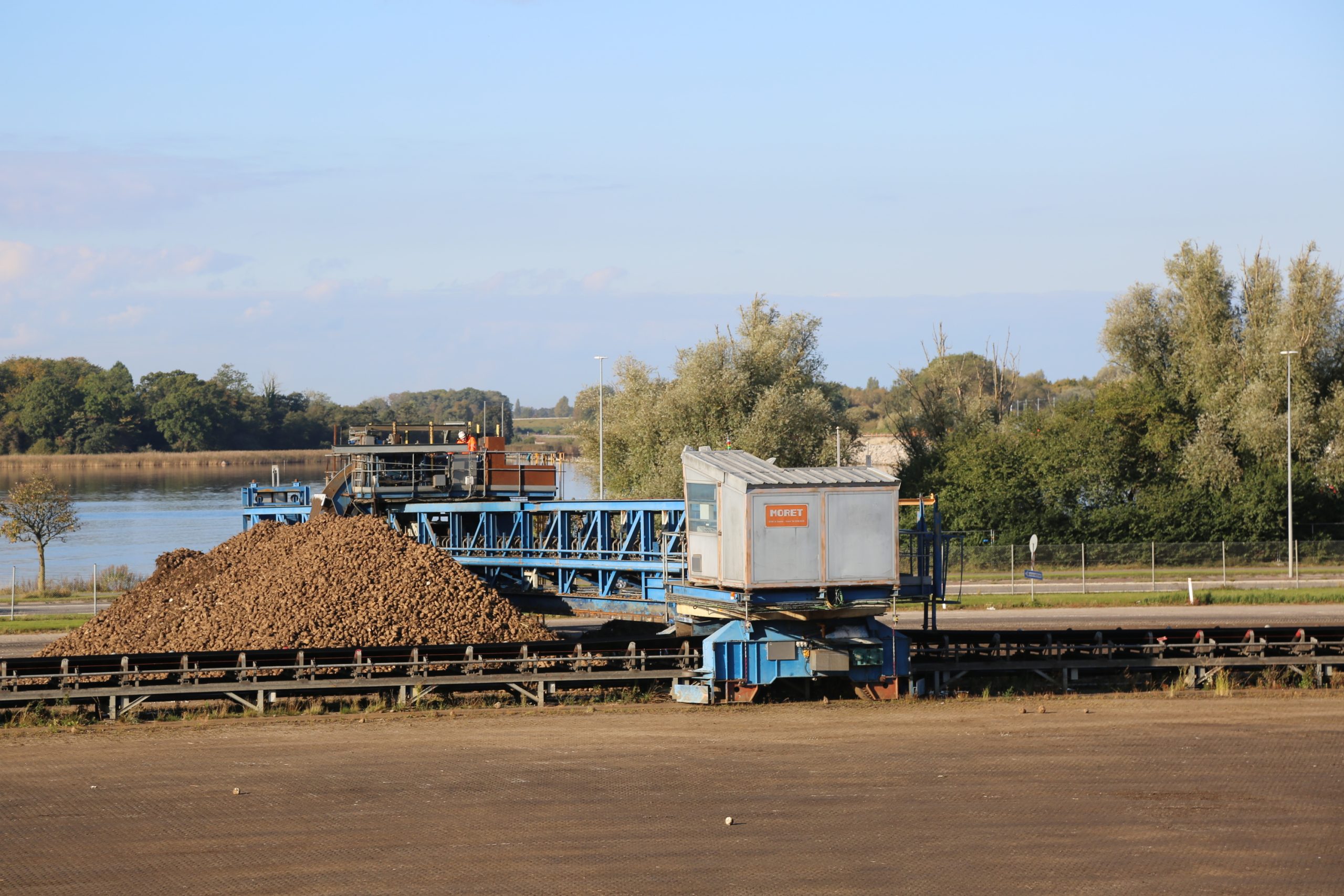 Når roerne er afleveret på roepladsen i Nykøbing Falster, samler et stort hjul – kaldet et Morethjul – roerne op og lægger dem på et bånd, der fører dem ind i fabrikken.