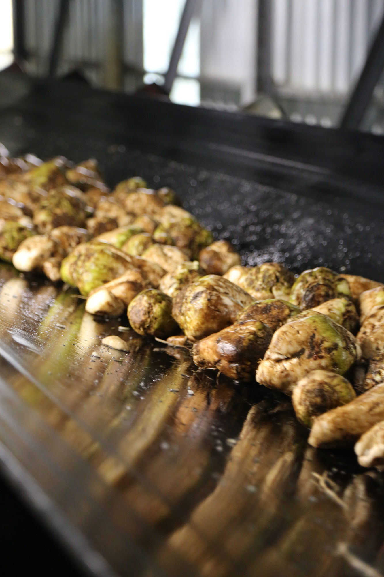 – Roerne bliver vasket, og jordpartiklerne fjernet. Derefter bliver de snittet til trekantede ’pomfritter’ og kommer over i et trug, hvor sukkeret bliver skyllet ud af de snittede roer. Vandet er cirka 70 grader varmt.